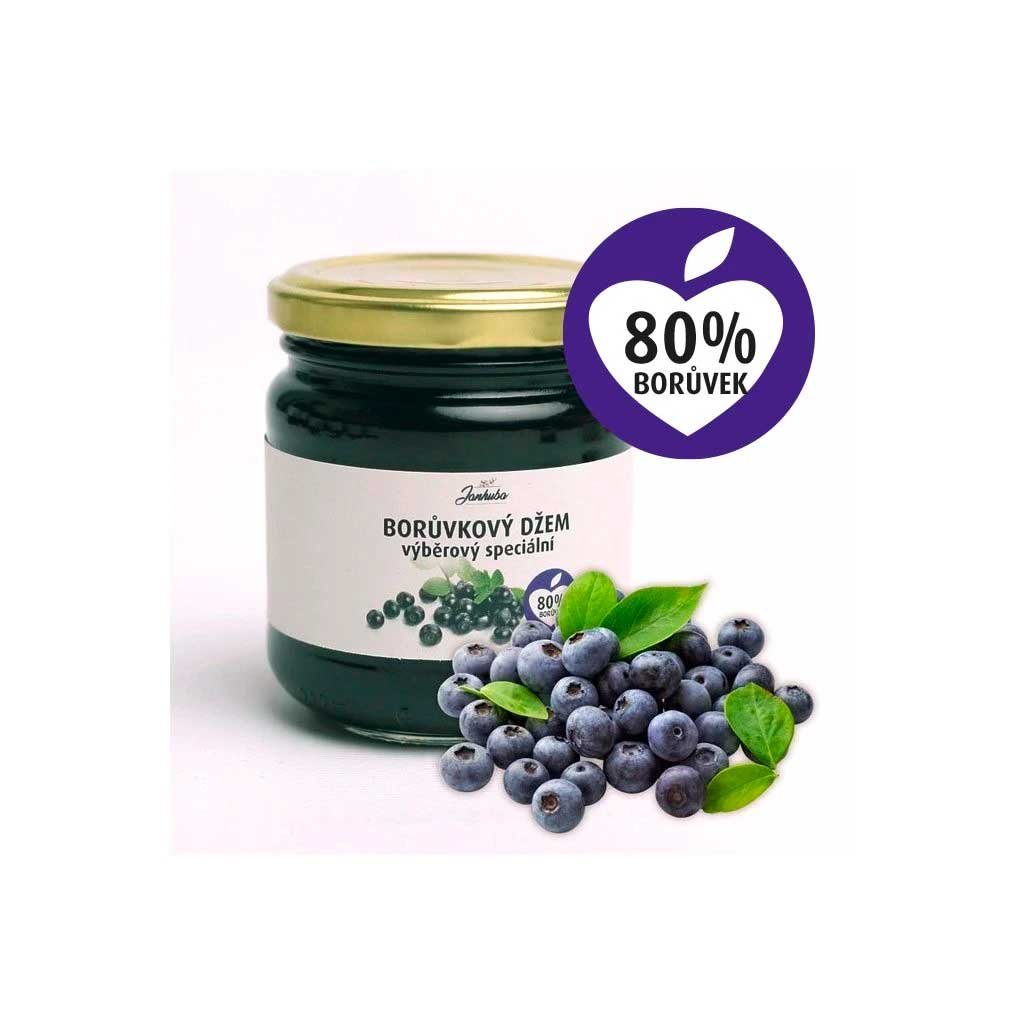 Džem výběrový speciální (obsah přírodních cukrů do 40%). Lesní borůvka 80%, cukr 19%, pektin, pasterováno. Na 100g výrobku bylo použito 80g ovoce. Ve 100g výrobku je obsaženo 29g přírodních sladidel.
