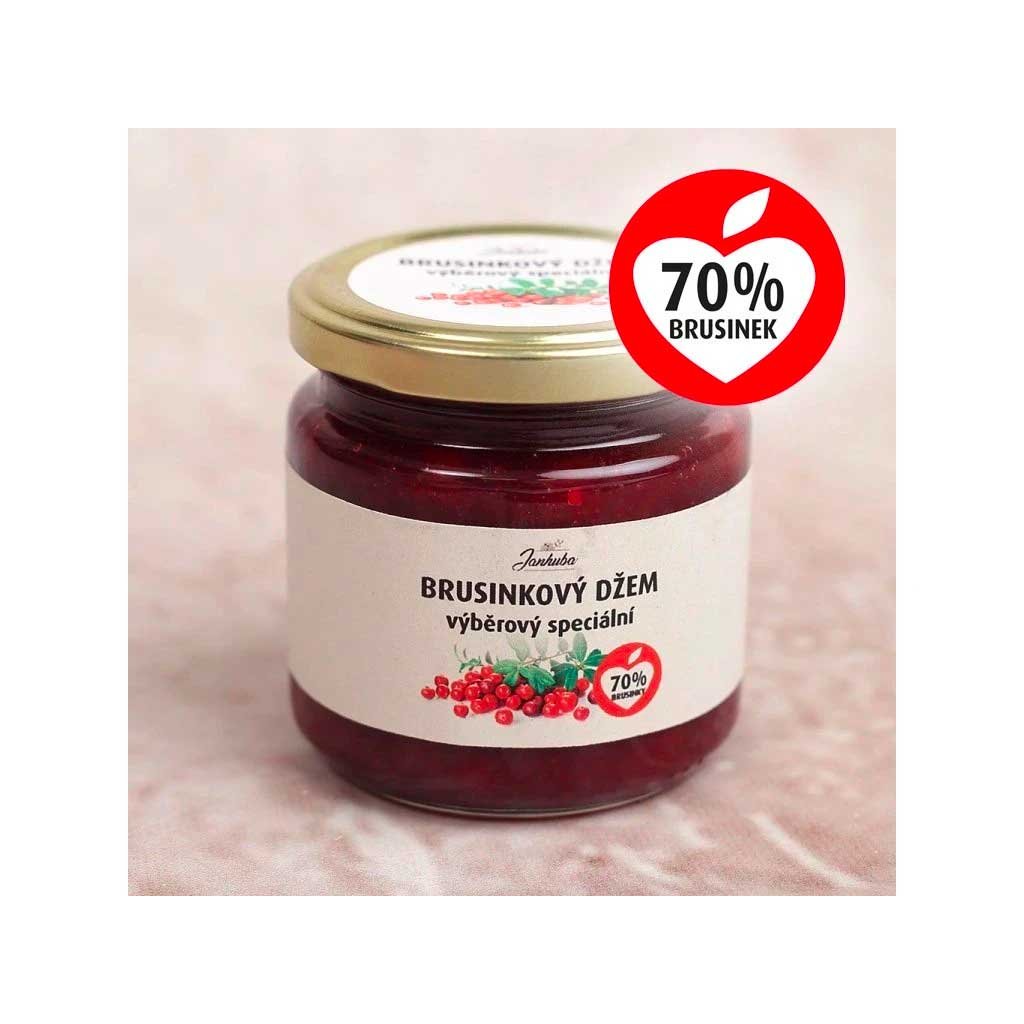 Džem výběrový speciální (obsah přírodních cukrů do 40%). Brusnice brusinka 70%, cukr 29%, pektin, pasterováno. Na 100g výrobku bylo použito 70g ovoce. Ve výrobku je obsaženo 38g přírodních sladidel.