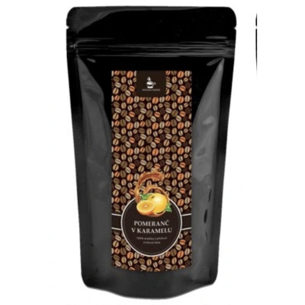Složení: zrnková káva 100% Arabica, aroma pomeranče a karamelu