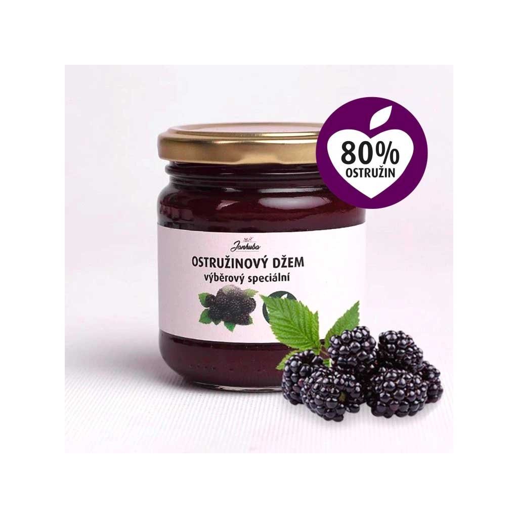 Džem výběrový speciální (obsah přírodních cukrů do 40%). Pasírovaná lesní ostružina 80%, cukr 19%, pektin, pasterováno. Na 100g výrobku bylo použito 80g ovoce. Ve 100g výrobku je obsaženo 25g přírodních sladidel.